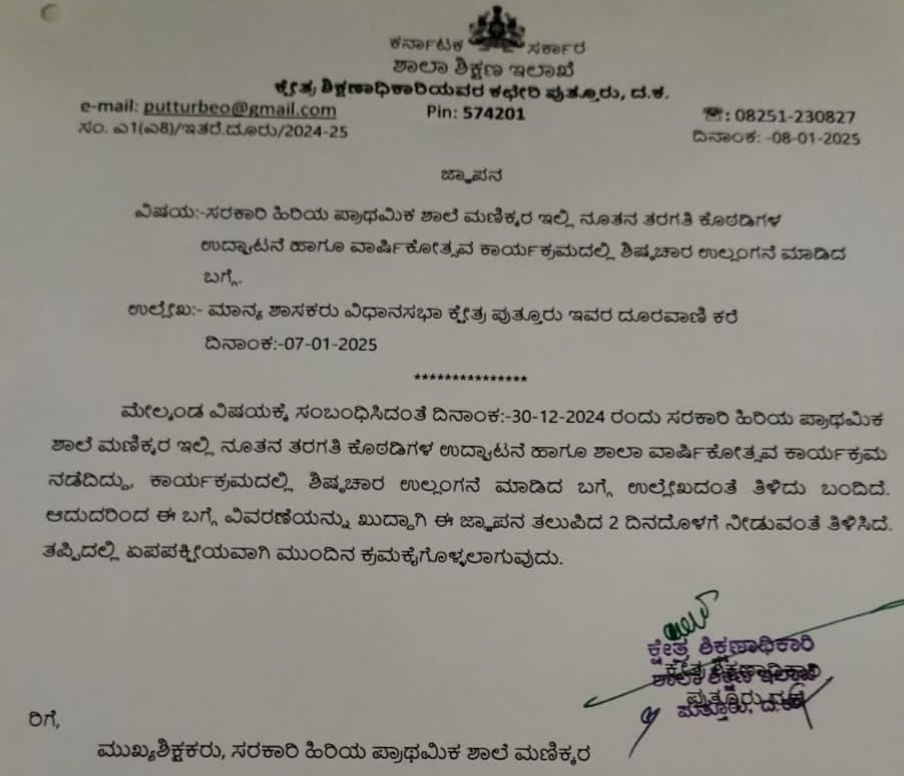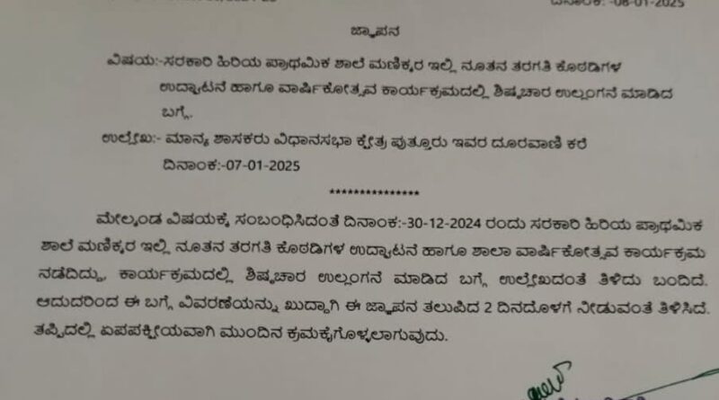 ಪುತ್ತೂರು: ಸರಕಾರಿ ಶಾಲಾ ನೂತನ ಕೊಠಡಿ ಹಾಗೂ ಶಾಲಾ ವಾರ್ಷಿಕೋತ್ಸವ ಕಾರ್ಯಕ್ರಮದಲ್ಲಿ ಶಿಷ್ಟಾಚಾರ ಉಲ್ಲಂಘಿಸಿದ ಆರೋಪದ ಮೇಲೆ ಕೊಳ್ತಿಗೆ ಗ್ರಾಮದ ಮಣಿಕ್ಕರ ಸರಕಾರಿ ಹಿ ಪ್ರಾ ಶಾಲೆಯ ಮುಖ್ಯ ಶಿಕ್ಷಕಿಗೆ ಶಿಕ್ಷಣ ಇಲಾಖೆಯಿಂದ ನೊಟೀಸ್ ಜಾರಿ ಮಾಡಲಾಗಿದೆ.