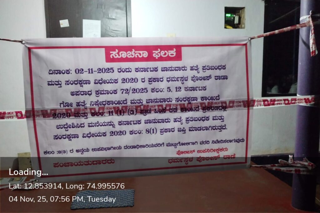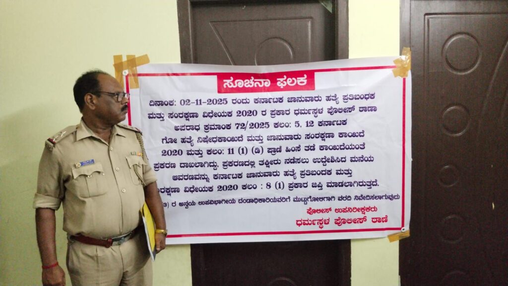 ಧರ್ಮಸ್ಥಳ ಪೊಲೀಸ್ ಠಾಣಾ ಅಪರಾಧ ಕ್ರಮಾಂಕ 72/2025, ಕಲಂ: 5, 12 ಕರ್ನಾಟಕ ಗೋ ಹತ್ಯೆ ನಿಷೇಧಕಾಯಿದೆ ಮತ್ತು ಜಾನುವಾರು ಸಂರಕ್ಷಣಾ ಕಾಯಿದೆ -2020 ಮತ್ತು ಕಲಂ: 11 (1) (ಡಿ) ಪ್ರಾಣಿ ಹಿಂಸೆ ತಡೆ ಕಾಯಿದೆ ಯಡಿಯಲ್ಲಿ ದಾಖಲಾಗಿದ್ದ ಪ್ರಕರಣದಲ್ಲಿ ತನಿಖೆ ನಡೆಸಿ, ಪ್ರಕರಣದ ಆರೋಪಿ ಇಬ್ರಾಹಿಂ ಖಲೀಲ @ತೌಸಿಫ್ ಎಂಬಾತನು ಅಕ್ರಮವಾಗಿ ಜಾನುವಾರುಗಳನ್ನು ಮಾಂಸ ಮಾಡಲು ಉದ್ದೇಶಿಸಿದ ಸಜೀಪನಡು ಗ್ರಾಮದ ತಂಚಿಬೆಟ್ಟು ಎಂಬಲ್ಲಿನ ಮನೆಯನ್ನು ಹಾಗೂ ಪ್ರಕರಣದ ಇನ್ನೊಬ್ಬ ಆರೋಪಿ ಮಹಮ್ಮದ್ ಸಿನಾನ್ ಎಂಬಾತನು ಸಜಿಪಪಡು ಗ್ರಾಮದ ಕೋಟೆಕಣಿ ಎಂಬಲ್ಲಿ ಮಾಂಸ ಇಡಲು ಉದ್ದೇಶಿಸಿದ ಕೋಣೆ ಜಪ್ತಿ ಮಾಡಲಾಗಿದೆ ಎಂದು ಪೊಲೀಸ್ ಪ್ರಕಟನೆಯಲ್ಲಿ ತಿಳಿಸಿದ್ದಾರೆ.