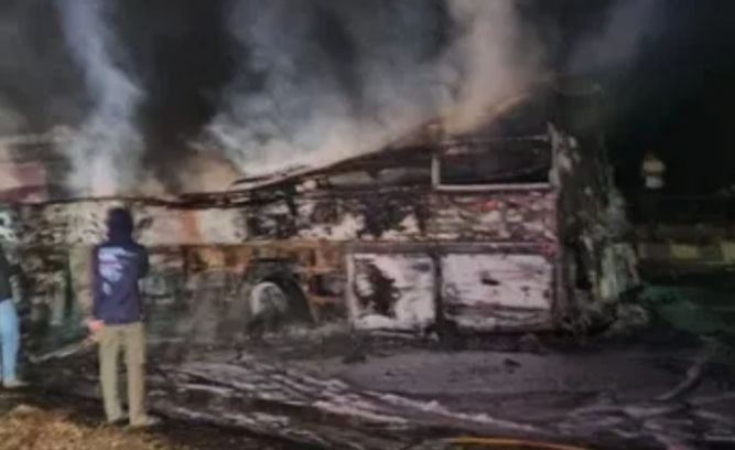 ಡಿಕ್ಕಿ ಬಳಿಕ ಕಂಟೇನರ್ ಲಾರಿ ಹಾಗೂ ಬಸ್ ಎರಡೂ ಬೆಂಕಿ ಹೊತ್ತಿಕೊಂಡಿದ್ದು, ಬಸ್ ಸಂಪೂರ್ಣವಾಗಿ ಸುಟ್ಟುಕರಕಲಾಗಿದೆ.