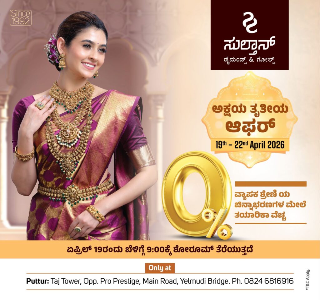 ಪುತ್ತೂರು: ಪುತ್ತೂರಿನ ಮುಖ್ಯ ರಸ್ತೆಯಲ್ಲಿರುವ ಸುಲ್ತಾನ್ ಡೈಮಂಡ್ಸ್ & ಗೋಲ್ಡ್ ನಲ್ಲಿ ಅಕ್ಷಯ ತೃತೀಯ ಪ್ರಯುಕ್ತ ಏ19 ರಿಂದ 22 ರವರೆಗೆ ಬಿಗ್ ಆಫರ್ ನಡೆಯಲಿದೆ. 0% ಮೇಕಿಂಗ್ ಚಾರ್ಜ್ ಜೊತೆಗೆ ಇನ್ನಿತರ ಆಫರ್ ಪ್ರಕಟಿಸಲಾಗಿದ್ದು ಇದರ ಸದುಪಯೋಗ ಪಡೆಯುವಂತೆ ಸುಲ್ತಾನ್ ಡೈಮಂಡ್ಸ್ & ಗೋಲ್ಡ್ ಮಳಿಗೆಯ ಪ್ರಕಟನೆಯಲ್ಲಿ ವಿನಂತಿಸಿದ್ದಾರೆ.